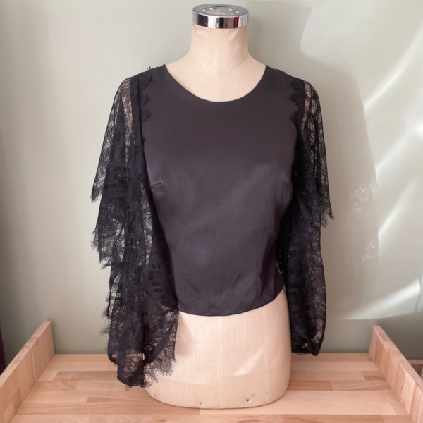 Les manches de ce haut sont fabriquées en dentelle de Calais, ajoutant une dimension de féminité et de délicatesse. Elles sont conçues de manière à être ouvertes sur le dessus du bras, créant ainsi un effet visuellement captivant. Pour une finition raffinée, les manches sont agrémentées d'élastiques fantaisie qui apportent une note d'originalité.